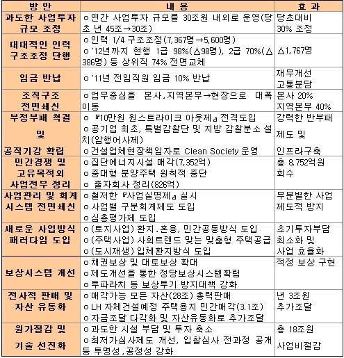 방안에 따르면 LH는 인력 구조조정 및 임금 반납 등 생살을 도려내는 고통분담과 대대적 인사쇄신 및 노사관계의 선진화를 추진할 방침이다.