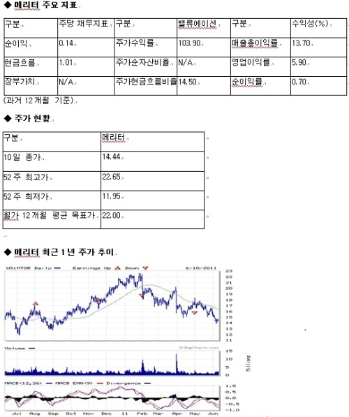 하지만 바닥을 찍은 이익과 주가는 강하게 반등, 펀더멘털에 청신호가 켜졌다는 평가다. 2분기 매출액이 37% 늘어난 데 이어 향후 전망치 역시 상승 곡선을 그리기 시작한 것. 월가 애널리스트는 향후 12개월 메리터의 주당순이익(EPS)이 무려 894% 급증할 것으로 예상하고 있다. 철강 가격 상승이 상당한 악재로 자리잡고 있지만 비즈니스가 제궤도를 찾았다는 진단이다. 팩트셋 리서치에 따르면 메리터의 베타는 3.7로 집계됐다.