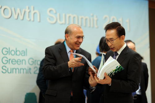 | 앙헬 구리아 OECD 총장이 이명박 대통령에게 '한국을 위한 OECD 사회정책보고서'를 전달하고 이야기를 나누고 있다. |