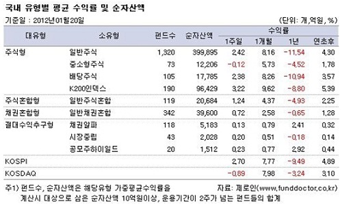22일 펀드평가사 제로인에 따르면, 20일 오전 공시 가격 기준으로 국내 일반주식펀드는 한주간 2.42% 의 수익률을 기록했다. 같은기간 코스피는 2.70% 올랐다.