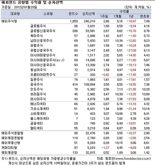 [뉴스핌=노희준 기자] 지난주 국내외주식펀드는 모두 플러스 수익률을 거뒀다. 국제 신용평가사인 스탠더드앤드푸어스(S&P)의 프랑스 등 유로존 국가의 신용등급 강등에도 불구하고 미국과 중국의 경제지표 호조, 유로존 국가의 국채 입찰 성공 등이 글로벌 증시의 상승세를 이끌었다.