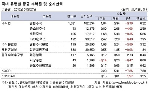 29일 펀드평가사 제로인에 따르면, 27일 오전 공시가격 기준으로 국내주식형펀드 평균 수익률은 한주간 2.01% 올랐다.