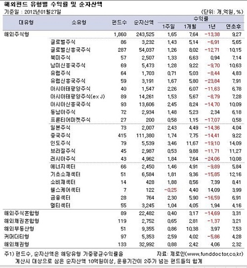 주간성과에서는 인도, 일본, 중국주식펀드가 선전했고, 중동과 아프리카 관련 기업주식에 투자하는 펀드가 부진했다.