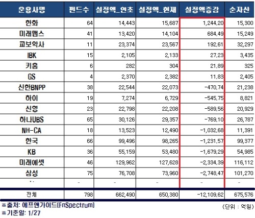 반면 삼성자산운용과 미래에셋자산운용, KB자산운용, 한국투자신탁운용 등 대형 운용사는 극심한 자금유출 흐름을 이어갔다.
