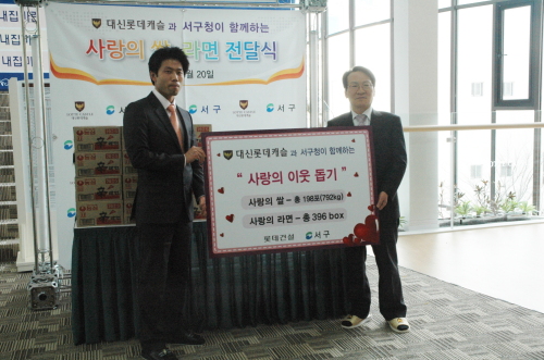 지난 20일 열린 증정식에는 박극제 부산 서구청장이 직접 참석했으며 롯데건설은 쌀 792㎏과 라면 396박스를 기증했다.