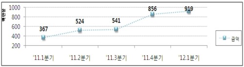 | 최근 일본기업 투자동향. 올해 1분기 일본의 대한투자는 9억 달러를 기록하며 사상최고치를 경신했다. (자료 지식경제부) |