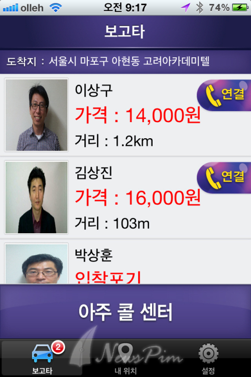 나윤호 아주모바일 개발2팀장은 “사당에서 신림동까지 기존 대리운전비용이 1만5000원정도라면 ‘보고타’앱은 가격입찰방식을 통해 대리기사들이 1만5000원을 기준으로 가격투찰이 진행된다”며 “1만원에서 1만5000원정도의 가격 투찰이 이뤄지면 가장 싼 금액을 제시한 대리기사가 고객을 모시러 가는 방식”이라고 했다.
