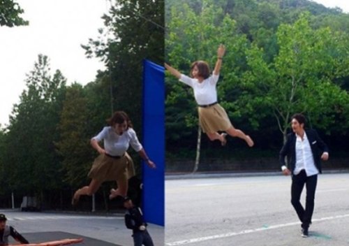 신현준이 공개한 김정은 굴욕사진은 김정은이 몸에 와이어를 달고 하늘을 날고 있는 모습이 찍힌 것으로 착지를 앞두고 겁에 잔뜩 질린 표정으로 코믹한 자세를 하고 있다.