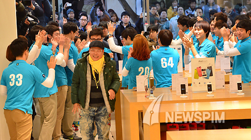 [뉴스핌=김학선 기자] 애플 아이패드 미니와 아이패드 레티나 디스플레이(4세대 아이패드) 공식 판매가 시작된 2일 오전 서울 중구 프리스비 명동점에서 아이패드 미니 1호 구매자인 송태민 씨(33)가 입장하며 직원들의 박수세례를 받고 있다.