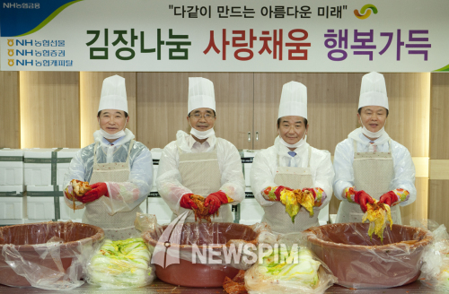 | NH농협금융 계열 3개사(NH농협증권, NH농협캐피탈, NH농협선물)는 11월 30일 영등포구 여의도동 소재의 농협문화복지재단 빌딩 9층 강당에서 '김장 나눔, 사랑 채움, 행복 가득' 행사를 실시했다. (왼쪽부터 NH농협증권 전상일 대표, 안병호 부사장, NH농협캐피탈 배판규 대표, NH농협선물 문경래 대표) |