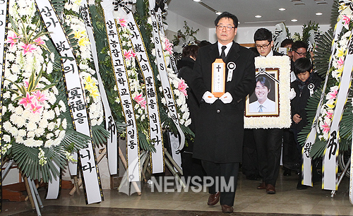 [뉴스핌=최진석 기자] 8일 오전 서울 성북구 안암동 고려대병원 장례식장에서 엄수된 故 조성민의 발인식에서 유가족들이 영결식장으로 이동하고 있다.