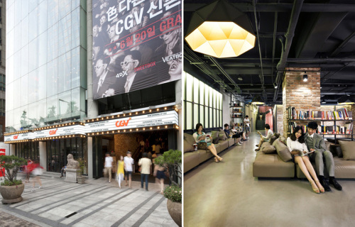 | CJ CGV신촌아트레온 외관(왼쪽)과 지하 3층 씨네마 라운지를 즐기는 고객 [사진=CJ CGV 제공] |
