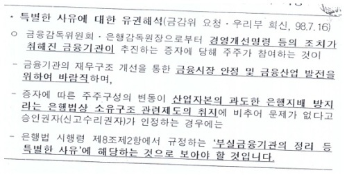 이 문건에 따르면 '산업자본의 과도한 은행지배 방지라는 은행법상 소유구조 관련 제도의 취지에 비춰 문제가 없다고 승인권자가 인정하는 경우'라고 예외승인의 특별한 사유에 대해 유권해석하고 있다.