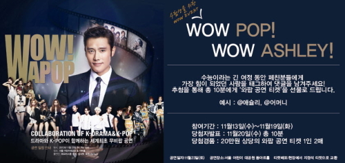 응모방법은 애슐리 페이지에서 ‘좋아요’를 누른 후 댓글을 달면 된다. 총 10명을 추첨하여 1인 2매씩 총 20명에게 와팝 공연 티켓을 선물로 증정한다. ‘공유하기’를 하면 당첨 확률은 더욱 높아질 수 있다.