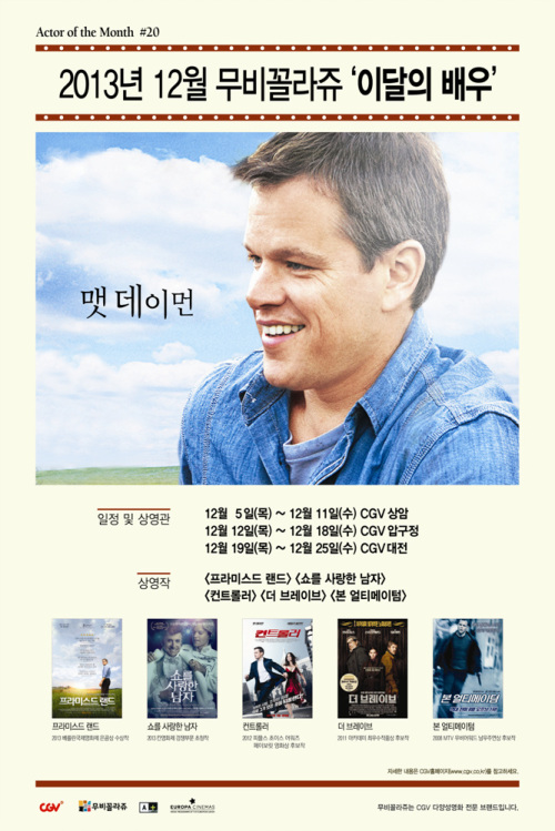 CGV 무비꼴라쥬는 ‘이달의 배우 기획전’을 통해 내달 5일부터 11일까지는 CGV상암, 12일부터 18일까지는 CGV압구정, 19일부터 25일까지는 CGV대전에서 맷 데이먼의 명품 연기가 돋보이는 주요작을 선보인다.