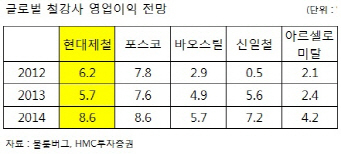 [뉴스핌=김홍군 기자]현대제철의 영업이익이 내년부터 급증할 전망이다. 현대하이스코 냉연부문과의 합병으로 규모 뿐만 아니라 수익성에서도 시너지가 예상되기 때문이다.