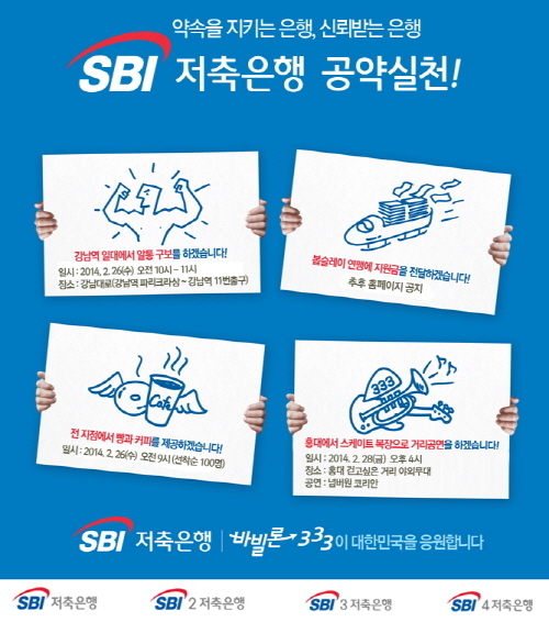 이 네 가지 공약들은 '약속을 지키는 은행, 신뢰받는 은행 SBI 저축은행'이라는 '공약실천'편으로 이어지고 '공약실천'은 26일부터 진행된다.