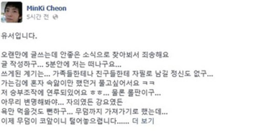 | 피미르 천민기 자살 기도 [사진=천민기 페이스북] |