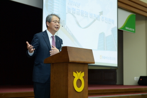 임종룡 회장은 서울영업본부 소속 영업점장 180여 명이 참석한 이날 특강에서 '2014년 농협금융의 비전과 추진전략'을 주제로 직접 프리젠테이션을 진행하며, 카드 정보유출로 흐트러진 조직분위기 조기 수습을 통한 업무추진태세 확립을 강조했다.