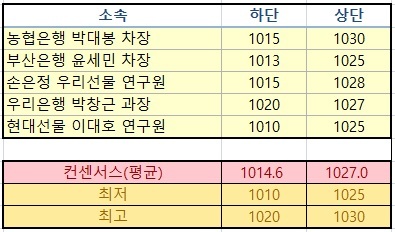 또 예측 고점으로 이번 조사에 참여한 환율 전문가 5명 중 2명이 1025원을 제시하며 상단이 1020원 중반에서 형성될 것으로 컨센서스가 모아졌다. 나머지 3명은 1027원,1028원,1030원을 제시했다.