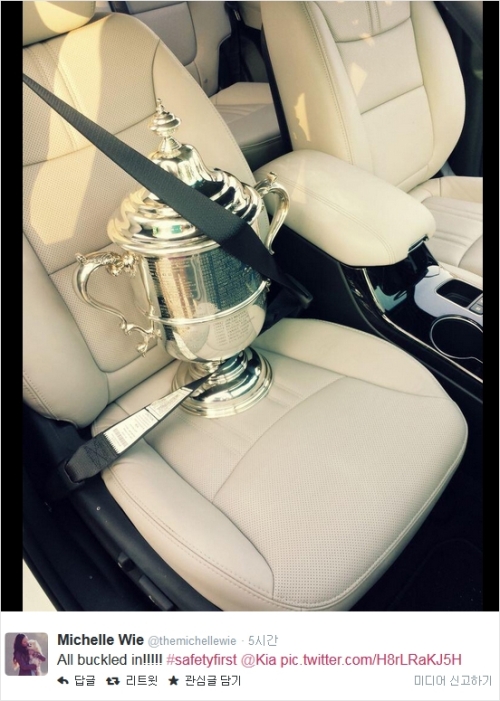 미셸 위는 22일(현지시간) 경기를 마친 직후 자신의 SNS를 통해 안전벨트를 착용한 우승트로피 사진을 게재했다.