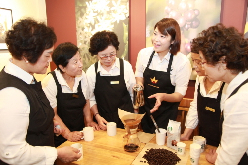 [뉴스핌=강필성 기자] 스타벅스커피 코리아(대표 이석구)는 지난 14일 박세정 제 10대 커피대사가 스타벅스 재능기부 카페 1호점인 서대문종합사회복지관 ‘카페 이스턴’(서울 남가좌동 소재)을 방문해, 복지관 소속 실버 바리스타를 재능기부 활동을 전개했다고 15일 밝혔다.