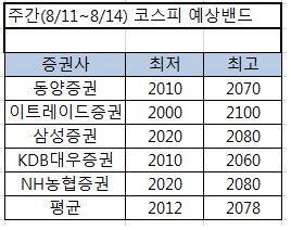 국내 5개 증권사들의 평균 코스피 예상밴드 하단과 상단은 각각 2012, 2078포인트로 집계됐다. 지난주 예상 밴드 하단과 상단이 각각 2040, 2096포인트였음을 감안하면 눈높이는 다소 낮아진 셈.