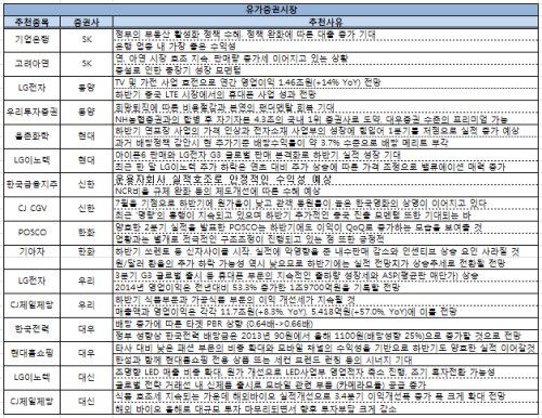 이 외에도 해외바이오 실적개선으로 3, 4분기 이익개선폭 증가가 전망되는 CJ제일제당과 글로벌 전략 거래선 내 신제품 출시로 모바일 관련 부품 카메라모듈 공급이 증가하는 LG이노텍 등이 추천주에 올랐다.