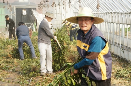 | 이희권 대표(우측 첫번째)가 비닐하우스 내 고추밭을 정리하고 있다. |