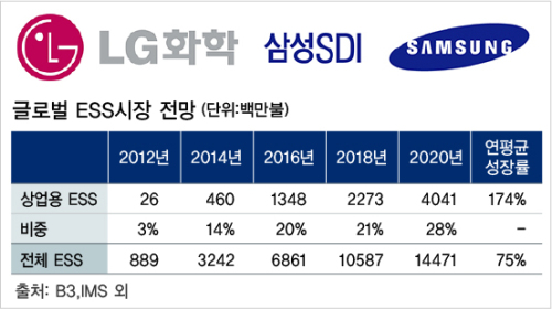 이런 맥락에서 세계 ESS 배터리 시장은 날로 성장성이 커지고 있다. 일본 2차전지 조사기관 B3에 따르면 이 사장은 지난 2012년 기준 8억8900만달러(약 1조원)에 불과했으나 올해 32억4200만달러(약 3조5000억원) 수준까지 2년만에 고성장을 이뤘다. 오는 2020년에는 144억7100만달러(약 16조원) 규모까지 성장할 것으로 점쳐진다. 시장조사업체인 네비건트 리서치에 따르면 ESS 산업 전체로는 지난해 16조원 규모에서 2020년 58조원 규모로 연평균 53%의 폭발적인 성장세가 이어질 것으로 예상되고 있다.