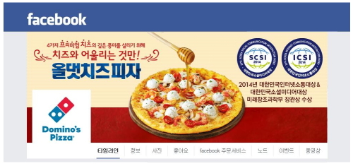 도미노피자는 웹, 블로그, 페이스북, 트위터, 소셜 프로모션, 소통 마케팅 효과, 운영성 항목 평가결과 종합점수 AAA인 최고 평점을 기록했으며 전체 기업 및 공공기관 통합 1위를 차지해 미래창조과학부 장관상을 수상했다.