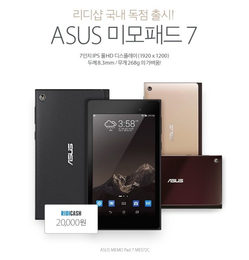 [뉴스핌=이수호 기자] 에이수스는 지난 23일 독서용 타블렛 미모패드 7(MeMo Pad 7) ME572C을 타블렛PC 전문쇼핑몰 리디샵(shop.ridibooks.com)을 통해 단독 출시한다고 24일 밝혔다.