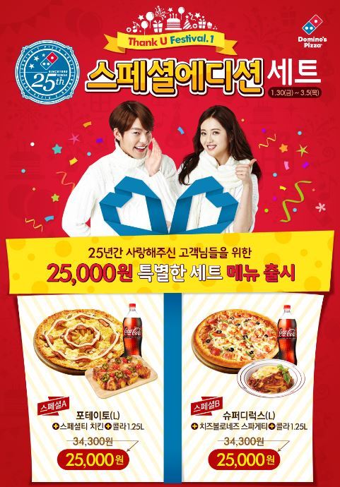 ‘25주년 스페셜에디션 세트’는 1990년 한국도미노피자 오픈 이후 25년 동안 가장 인기가 많았던 도미노피자의 베스트셀러 피자로 구성한 세트 메뉴 2종(스페셜 A, B세트)이다.