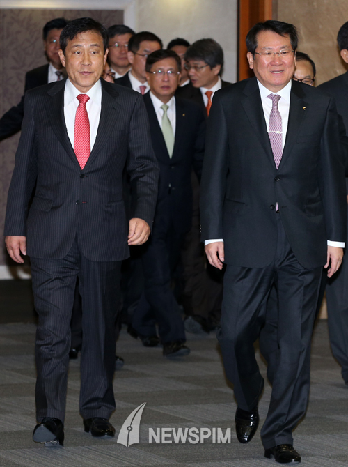 | 김정태 하나금융지주 회장(왼쪽)과 김한조 외환은행장 |