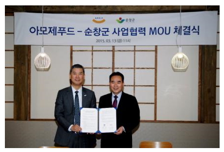 [뉴스핌=이연춘 기자] 종합외식기업 아모제푸드(회장 신희호)는 지난 13일 잠실 롯데월드몰 지하1층 ‘푸드캐피탈 왕궁’ 매장에서 순창군과 건강장수식단 공동개발 및 한식 프랜차이즈화 등을 위한 상호협력 체제를 구축하는 양해각서(MOU)을 체결했다고 15일 밝혔다.