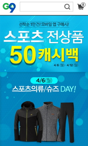 G9는 야외활동이 많아지는 4월을 맞아 고객들의 스포츠용품 구매 부담을 덜어준다는 취지로 이번 행사를 마련했다. 해당 기간 동안 G9 모바일 앱에서 6개의 캐시백 적용 카테고리 상품을 구입하면 구매 금액의 50%(최대 1만원)를 G캐시로 받을 수 있다.