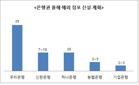 우리은행은 올해 말까지 해외 7개국에 25개 지점을 신설하기로 했다. 인도네시아에 10개 지점을 새로 내는 것을 비롯 미국에 3개, 중국에 5개 지점을 늘린다.