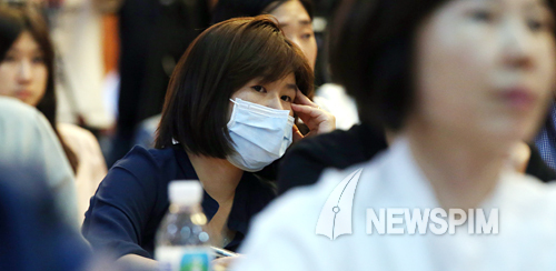 [뉴스핌=김학선 기자] '메르스 사태'가 악화되고 있는 4일 오후 서울 중구 포스트타워 대회의실에서 열린 "메르스 바로 알고 극복하자" 민관 합동 세미나에서 한 참석자가 마스크를 쓴 채 강연을 경청하고 있다.