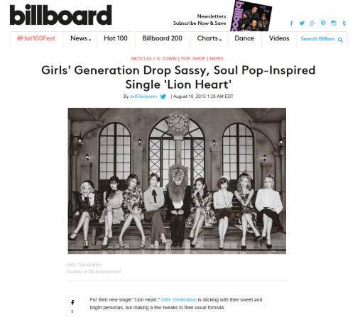 게다가 소녀시대의 새 앨범 타이틀곡 ‘Lion Heart’가 공개되자마자 미국 유명 매체 빌보드는 지난 18일(현지시간) K-POP 칼럼코너 ‘K-TOWN’을 통해 "Girls' Generation Drop Sassy, Soul Pop-Inspired Single 'Lion Heart'(소녀시대가 소울 팝 스타일의 멋진 ‘Lion Heart’를 내놓다)”라는 제목의 기사를 실었다.