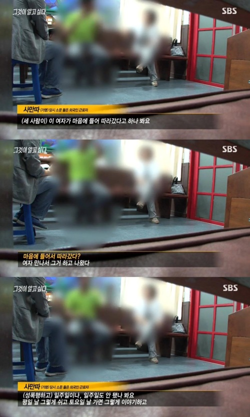 이어 대구에 살고 있는 한 외국인 근로자 역시 "술이 많이 마신 여자가 길에 넘어져 있었다고 했고 그 다음에 어디 다리 밑으로 데려가 성폭행했다는 얘기를 들었다"고 전했다.