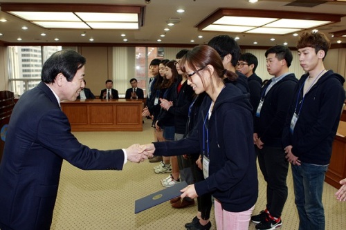 | <이원태 수협은행장이 18일 서울 송파구 소재 수협중앙회에서 열린 제5기 수협은행 대학생 홍보대사 발대식에서 이다은(강원대) 학생에게 위촉장을 주고 있다./사진=수협은행> |