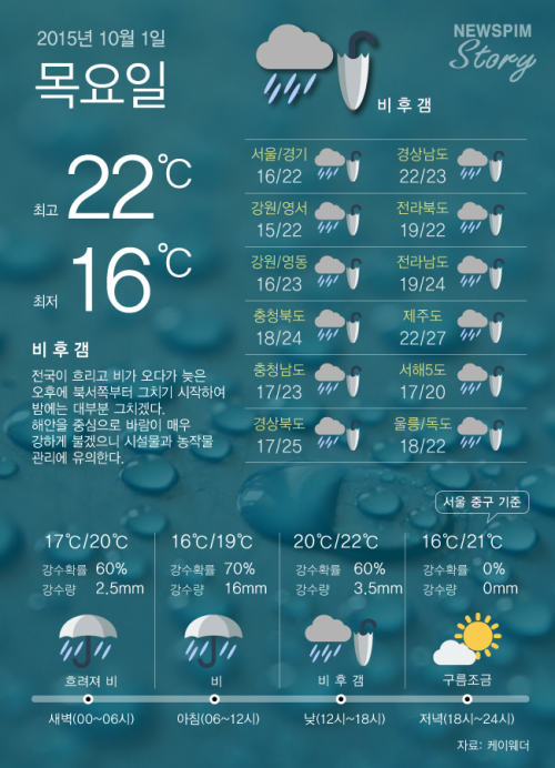 케이웨더(K Weather)에 따르면 이날 전국은 동해상에 위치한 고기압의 가장자리에 들어 흐리겠으나 남부지방은 제 21호 태풍 '두쥐안(DUJJUAN)에서 약화된 열대저압부의 간접 영향을 받아 비가 내리는 곳이 있겠다.
