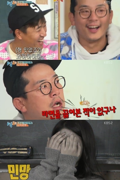 멀리서 그 모습을 지켜보던 차태현은 “(설현이 끓여준 라면이) 짜다”고 추측했고 라면 맛을 본 김주혁, 김준호, 김종민은 이를 부정하지 않았다.