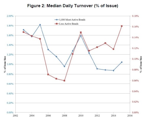 이 과정에서 채권 거래 단위는 전반적으로 줄어든 것으로 나타났다. 일례로 채권시장의 평균 거래량과 500만달러 이상의 대규모 채권거래 비중은 감소했다. 2007~2013년까지 시장에서 가장 활발하게 거래되던 1000종의 채권들은 평균 거래량이 35% 감소했다고 보고서는 밝혔다.