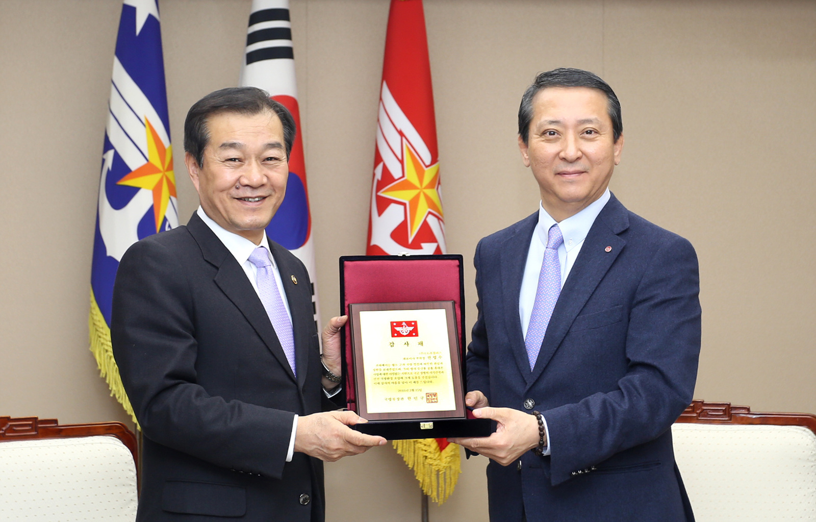 이날 감사패 전달식에서 권영수 LG유플러스 부회장은 황인무 국방부 차관에게 감사패를 전달받고 향후 강력한 보안 대책을 기반으로 병사들의 병영 생활 및 소통 환경 개선에 힘을 다하겠다는 뜻을 전했다.