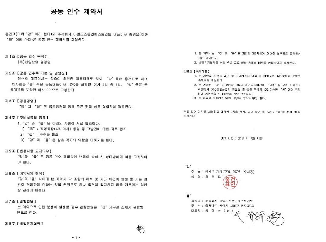 | 신일컨소시엄측에서 공개한 신일산업 공동인수(홍건표-마일즈스톤인베스트먼트) 계약서 |