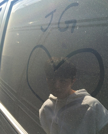 이와 함께 진구는 먼지가 잔뜩 낀 자동차 창문에 하트를 그린 뒤 창문에 비치는 자신의 모습을 사진으로 찍어 남겼다.