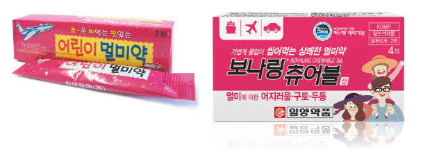 일양약품은 씹어먹는 형태의 멀미약 ‘보나링 츄어블’을 판매하고 있다. 제품은 차량 탑승 전 30분 이전 복용하면 멀미예방 효과를 볼 수 있으며 복용시 물이 필요하지 않아 차에 탑승한 이후에도 급히 복용할 수 있다.