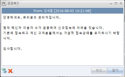 프리본드 관리자는 “메신저 이용자 수 급증으로 신규 접속에 어려움이 있으니 가급적 접속상태를 유지하기 바란다”고 공지했다.