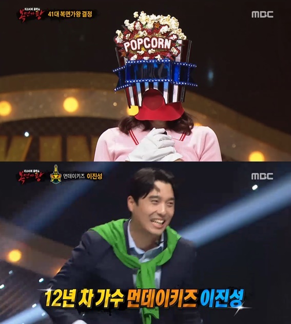 ‘복면가왕 팝콘소녀’는 ‘복면가왕 에펠탑’을 70대 29로 꺾고 41대 가왕에 안착했다. 아쉽게 탈락한 ‘복면가왕 에펠탑’은 먼데이키즈 이진성으로 밝혀졌다.